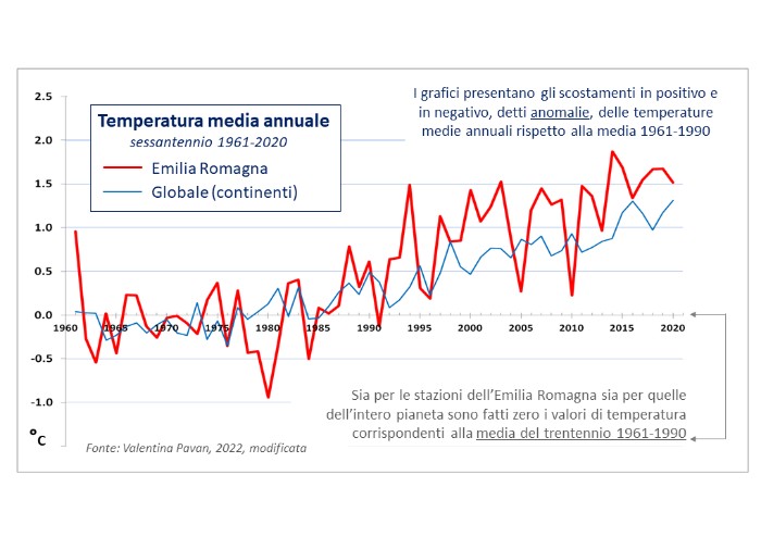 È risultato inoltre che la tendenza all’aumento della temperatura media annua è più alta nei territori emiliano-romagnoli rispetto alla media globale con valori che nell’ultimo decennio eccedono i +1.5 °C rispetto al periodo di riferimento 1961-1990.