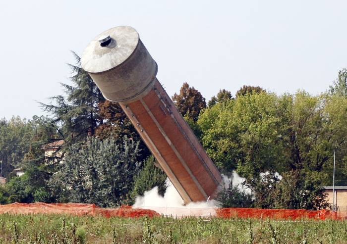 Precedute da tre segnali acustici, sono state 25 le esplosioni che oggi a mezzogiorno in punto, hanno consentito la demolizione della torre dell’ acquedotto di San Donnino, in strada Tre Case a Modena, alta circa quaranta metri, non più utilizzata da molti anni e scollegata dalla rete idrica.