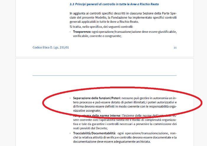 'In aggiunta ai controlli specifici descritti, la Fondazione ha implementato specifici controlli generali applicabili in tutte le Aree a Rischio Reato. Si tratta, nello specifico, dei seguenti controlli - si legge nel Modello - ogni operazione/transazione/azione deve essere giustificabile, verificabile, coerente e congruente; nessuno può gestire in autonomia un intero processo e può essere dotato di poteri illimitati; i poteri autorizzativi e di firma devono essere definiti in modo coerente con le responsabilità organizzative assegnate; l’insieme delle norme dell’ente deve essere coerente con l’operatività svolta ed il livello di complessità organizzativa e tale