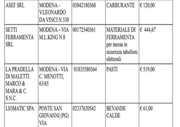 – prodotti di ferramenta per tabelloni e cabine elettorali (444,67 euro)