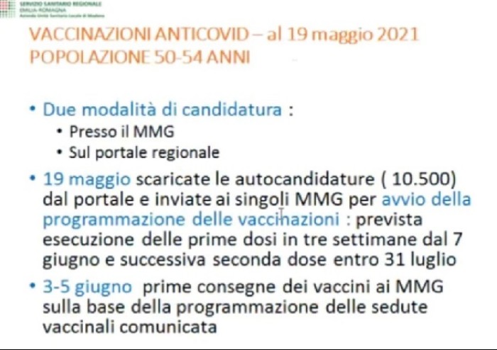 Quella dai 50 ai 54 anni è la fascia della popolazione alla quale è stata estesa, nelle ultime settimane, la possibilità di sottoporsi alla vaccinazione, e quella dalla quale e sulla quale si generano più domande. Quesiti posti soprattutto da coloro che essendosi prenotati (10.500 al 19 maggio in provincia di Modena), contattando il proprio medico di medicina generale o accedendo al portale regionale sulle vaccinazioni, non hanno ancora ricevuto risposta. Domande girate questa mattina alla coordinatrice del piano vaccinale dell'Ausl in provincia di Modena Silvana Borsari che su questo punto ha risposto accompagnando le sue parole ad una slide: 'L'Ausl sta raccogliendo le prenotazioni arrivate al 19 maggio. Sulla base di queste fornirà ai medici di famiglia le dosi richieste che già da ora sono garantite dalla fornitura del vaccino Pfizer. Procedura che si concluerà entro i primi fi giugno.I candidati al vaccino riceveranno la conferma dell'appuntamento per la vaccinazione e le vaccinazioni inizieranno dal giorno 7 con le prime dosi. Trattandosi del vaccino Pfizer dovranno trascorrere 35 dosi per l'inculazione della seconda. Le forniture sono garantite, per cui dovremmo concludere la copertura di coloro che si sono prenotati in questa fascie di età entro il 31 luglio'.