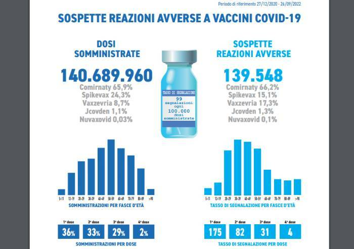 Nel periodo considerato sono pervenute 139.548 segnalazioni su un totale di 140.689.690 di dosi somministrate (tasso di segnalazione di 99 ogni 100.000 dosi), di cui l’81,5% riferite a eventi non gravi, come dolore in sede di iniezione, febbre, astenia/stanchezza, dolori muscolari.