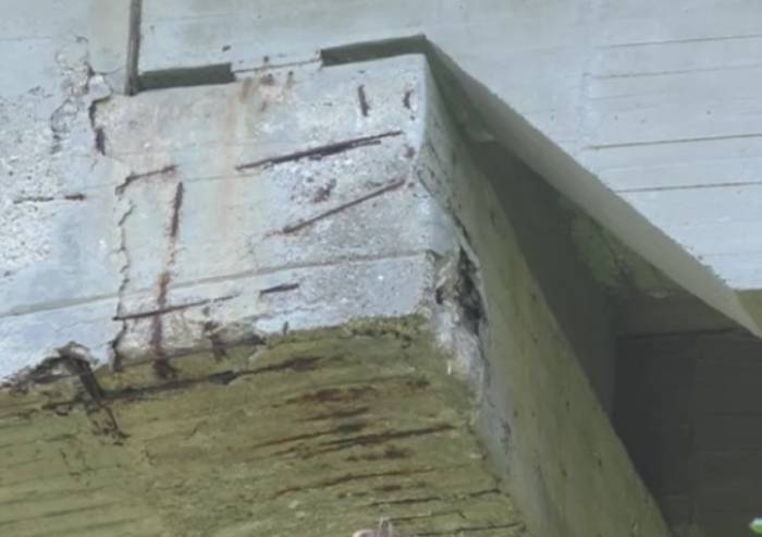 I segni dell'erosione degli agenti atmosferici sono evidente. Con la struttura d'acciaio del cemento armato scoperta, con profonde cavità e fessurazioni nel cemento armato e con i segni del distacco anche di precedenti lavori di manutenzione. Sarà Anas, competente per l'opera, a dovere valutare (e vogliamo credere che nei controlli trimestrali che dovrebbero essere cadenzati ed eseguiti per un'opera di questo tipo), i potenziali effetti di tale erosione in termini strutturali. Qui ci limitiamo a proporre le immagini, commentate, che abbiamo raccolto sul posto.