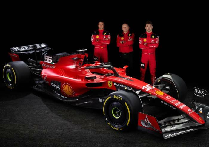 La Ferrari SF-23 è un'evoluzione della monoposto dello scorso anno ed ha un motore V6 da 1.600 cc. Le novità riguardano soprattutto la sospensione anteriore e il muso più corto rispetto alla passata F1-75. Tanto rosso e anche nero, in particolare sull'ala posteriore dove campeggia la scritta 'Ferrari'.