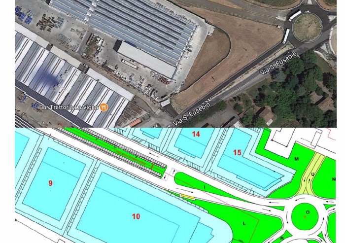 Quindi, stante così la realtà, risulta che questa variante al piano particolareggiato non è una variante, ma una sanatoria ad uno stato di fatto diverso da quanto previsto dall'attuale piano particolareggiato'. Da questa immagine aerea di nota effettivamente l’unità produttiva attualmente gravante sul lotto 10 nonostante questo sia vincolato ad uso terziario dal vigente Piano Particolareggiato.