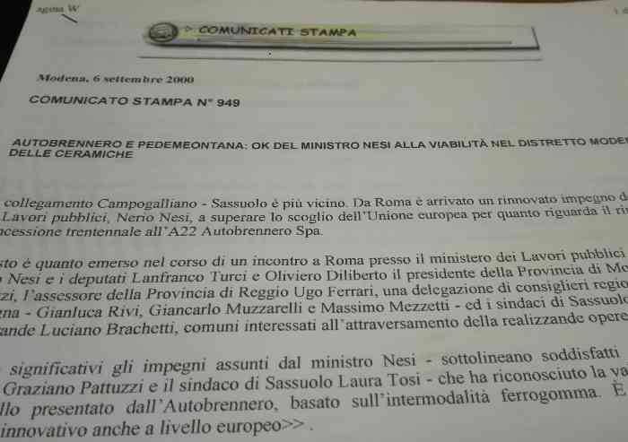 Nella foto, dal nostro archivio, un comunicato stampa del 2000 in cui si relazionava dell'incontro sulla Bretella e sulla Cispadana con i parlamentari di sinistra e con l'allora neo assessore regionale Giancarlo Muzzarelli. A quel tempo ministro dei trasporti, ospite anche nella sede di Assopiastrelle era il Comunista Nerio Nesi