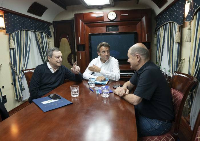 Un Premier che mentre viaggia ridacchiando in treno con Macron e Scholz aumenta la spesa militare, insulta Putin, non parla mai di pace...