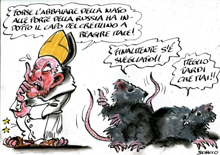 Finalmente Papa Bergoglio esce fuori, e dice le cose come stanno: 'L'abbaiare della Nato alle porte della Russia'! Infatti sono stati gli ucraini ad aver chiesto di entrare nella Nato, e mi fanno ridere gli interventisti quando si stupiscono per quale assurdo motivo gli ucraini non possano aver il diritto di chiederlo senza che un 'dittatore feroce' li invada militarmente! Ecco, epperò vorrei proprio vedere gli intervisti, se gli amanti delle loro mogli si comprassero la casa accanto la loro... Paride Puglia