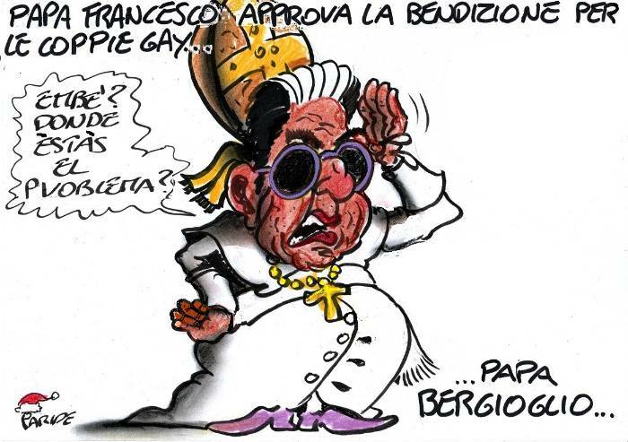 Bergoglio precisa che non è un matrimonio, ma la benedizione per le coppie gay è decisamente un'apertura notevole in direzione proprio delle coppie omosessuali. E vogliamo altresì precisare, fin da subito, che da un punto di vista laico dello Stato è del tutto evidente che non essendo quello omosessuale proprio un matrimonio, ciò non di meno sempre gli omosessuali devono avere immancabilmente gli stessi diritti sul lavoro, sulla sanità e su tutti i piani della società civile: su questo non ci piove, anzi massimo rispetto e massima dignità per tutti, a prescindere dagli orientamenti sessuali. Punto.