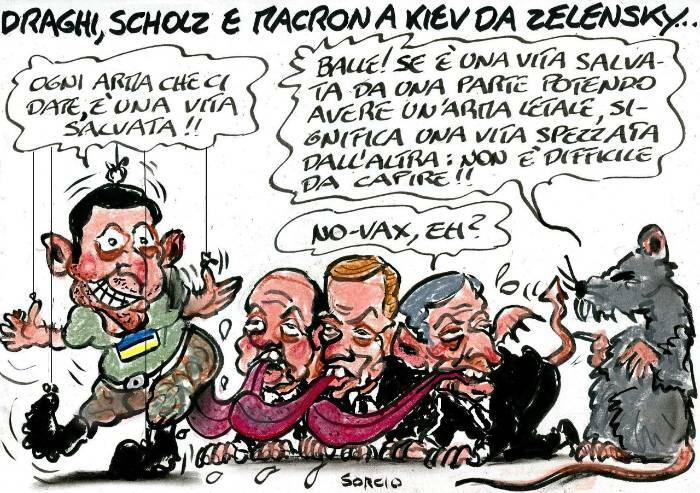 Zelensky con quella maglietta militare, a me fa ridere non poco, ma mi fa ridere un po' meno il fatto che con tutti i soldi che il Drago ha regalato a Zelensky, non solo, chessò i terremotati avrebbero finalmente un tetto decente sulla testa, ma persino la piscina e l'auto nuova. Caro Drago, ammettiamolo, insomma non poteva funzionare, sei troppo pieno di te e hai leggermente sovrastimato il tuo carisma, complice quell'incredibile Mattarella. Ora però devo anche dire che non mi sembri neanche questo gran dittatore che ti disegnavo: ahimé devo constatare che la dittatura è dentro di noi, a pelle mi dà più fastidio l'accozzaglia, cioè quel misto di miserie politiche e commedie umane che sono il grillismo e il salvinismo ed ora il melonismo d'accatto, che poi è quello che ci toccherà. Per non dire dei soliti dalemiani e bersaniani da bocciofila. Letta è solo un piccolo belligerante de noiatri. Di male in peggio, direi, ma alle invasioni barbariche bisogna farci il callo: il Belpaese un pò come il Sasòl mangia allenatori, cambia cambia alla fine nessuno va bene e ti ritrovi sempre a metà classifica. Boia d'un mònd leder. Paride Puglia