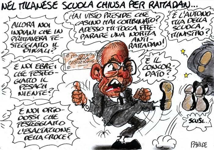Ma nel 1984, il Protocollo addizionale, nel punto 1... 'Si considera non più in vigore il principio, originariamente richiamato dai Patti lateranensi, della religione cattolica come sola religione dello Stato italiano'. Tuttavia le Festività cattoliche son rimaste, ergo quindi già da allora si potevano abolire benissimo: perché non è mai stato fatto? Nessuna risposta (anche se io lo so, ma non lo dico!). Quindi, tenendo conto del fatto che il Ramadan lo si può festeggiare, epperò da qui a chiudere le scuole statali dell'istruzione (addirittura mi dicono dalla regia, e/o fermarsi sul posto di lavoro per pregare 4/5 volte al dì), magari a digiuno col rischio di farsi del male (e che la sanità paghi le conseguenze), ce ne passa, o no?