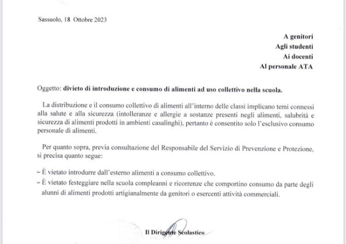 scrivo queste osservazioni per evidenziare alcune recenti decisioni apparentemente in contrasto tra loro della dirigenza scolastica del liceo sassolese Formiggini. Da una parte infatti la scuola non perde occasione per sottolineare e sostenere il grado di maturità degli studenti liceali avviandoli su percorsi di digitalizzazione, implementazione di competenze, progetti di inclusività e altri paroloni pieni di ridondante cultura. Dall’altra li si tratta da bimbi dell’asilo, ritenendo che non siano in grado di autogestirsi in materia di merende, torte e pizzette e venga loro preclusa la possibilità (che diversamente si realizza in ambito, sportivo, parrocchiale, associazionistico ad esempio) di portare una crostata o un vassoio di biscotti da condividere con gli amici e i professori per festeggiare un compleanno.