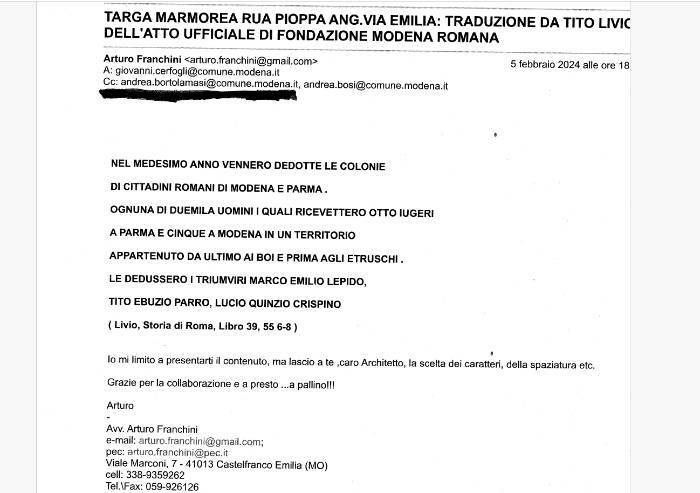 A riprova le allego la mia email del 5 febbraio al Responsabile dei lavori del Comune di Modena architetto Cerfogli, il quale mi richiedeva, ai primi del ridetto mese, alla vigilia cioè dell'approntamento e successiva installazione dei manufatti, il testo italiano esatto da riportare nella targa aggiuntiva.