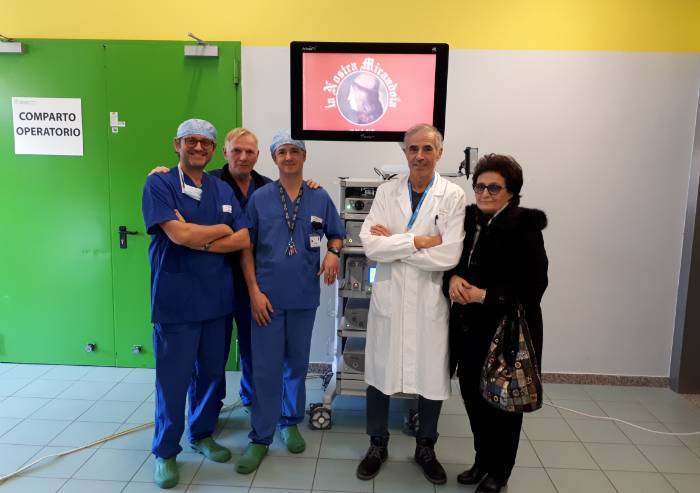 Da sinistra i medici Alessandro Ferrari, Gabriele Palumbo, Stefano Sassi, Franco Boselli e Nicoletta Vecchi Arbizzi, presidente associazione La Nostra Mirandola