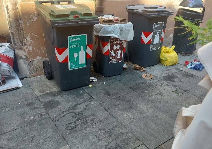 Ecco lo spettacolo a Modena in Sant'Eufemia ora. Oltre a occupare i marciapiedi resi inutilizzabili, ma questo è il meno, il selciato è intriso di perdite dai bidoni dell'umido, un odore ripugnante, uno spettacolo indecente per Modena e per i tanti turisti che la stanno frequentando.