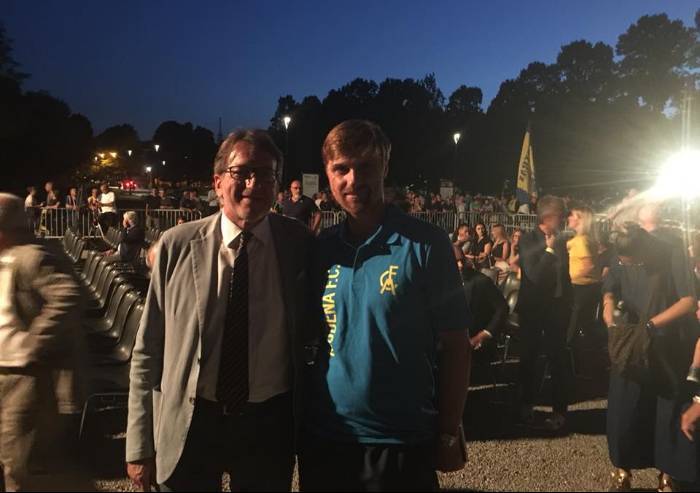 Nella foto il sindaco Muzzarelli ieri tornato al lavoro dopo la convalescenza e le ferie insieme all'allenatore del Modena calcio Luigi Apolloni