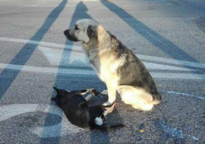 Inizialmente pensavo fosse un incidente, poi invece mi sono accorto del cane. Era in mezzo alla strada, fermo ad accudire il suo amico, ucciso probabilmente da un pirata della strada'. Secondo quanto riferito da alcune persone, l'animale era lì già dalle 5 del mattino. 'Qui tutti ricordano i due cani che giocavano spesso insieme in strada - racconta Milani -. Ho pubblicato le foto sui social perché volevo evitare che venisse portato in canile, ma per fortuna ha un padrone. A decine si erano già offerti di adottarlo'.