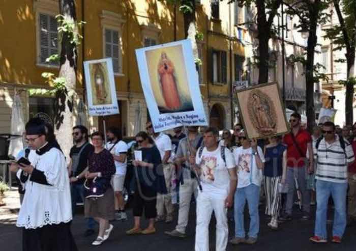 Il comitato aveva già fatto un'analoga processione in giugno in occasione del 'REmilia Pride' a Reggio Emilia. Alla processione, con la recita del Rosario, prendono parte diverse decine di persone, tra cui famiglie con bambini sul passeggino. Dopo aver attraversato il ponte bimillenario di Tiberio e alcune vie del centro, conclusione con una preghiera definita 'di riparazione' per il corteo dell'orgoglio gay in programma nel tardo pomeriggio, cui è previsto prenda parte anche la parlamentare Pd Monica Cirinnà.