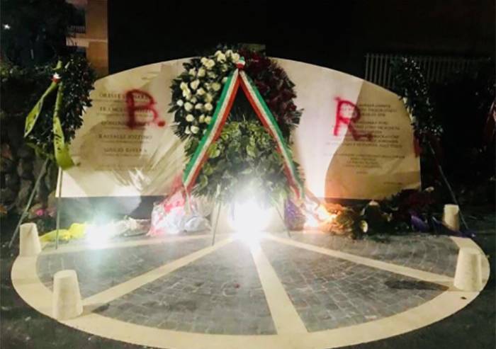 Imbrattata la lapide commemorativa di Aldo Moro e della sua scorta in via Fani a Roma, con una scritta che inneggia alle Brigate rosse.