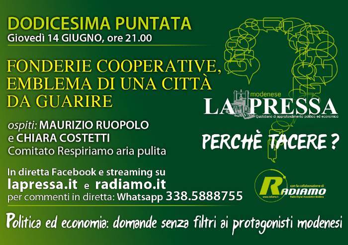 Fonderie cooperative, emblema di una città da guarire. E' questo il tema della dodicesima puntata di Perchè Tacere? la trasmissione de La Pressa in diretta Facebook e streaming video dagli studi di Radiamo, con la regia di Federico Orri, ogni giovedì sera a partire dalle 21.