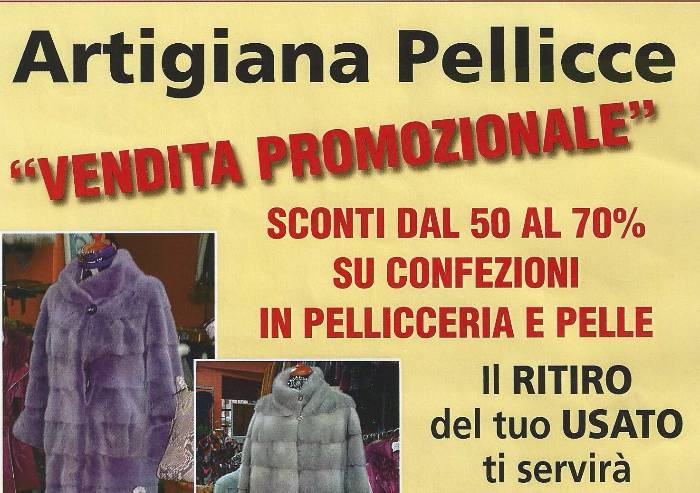 Vendita promozionale da Artigiana Pellicce in via Emilia Est 30 a Modena (059 235353). Sconti su confezioni in pellicceria e pelle e ritiro dell'usato. Ai clienti che si presenteranno come lettori de La Pressa verrà applicato un ulteriore sconto del 20%.